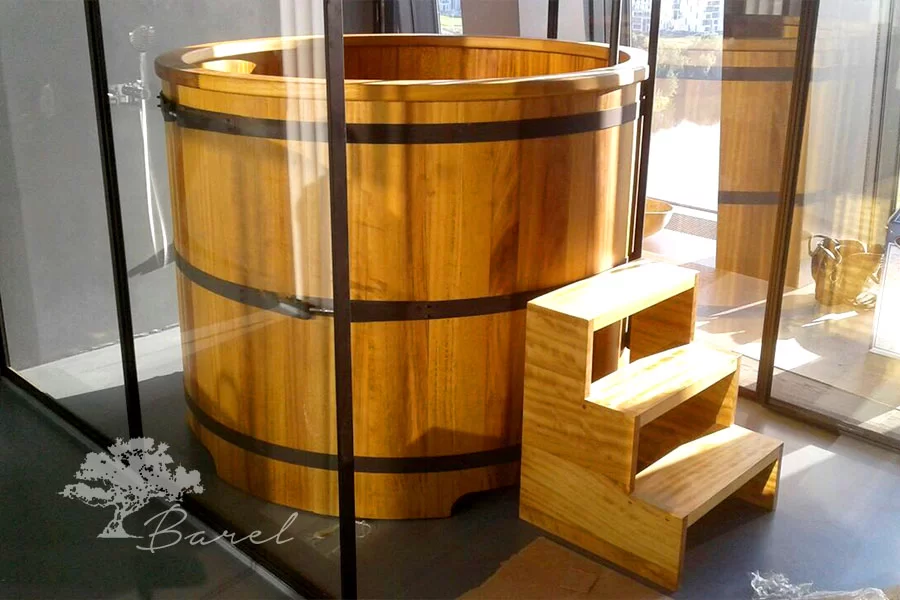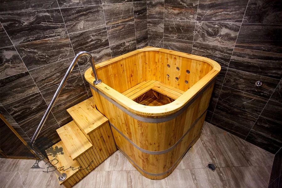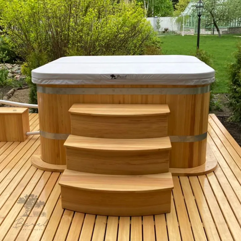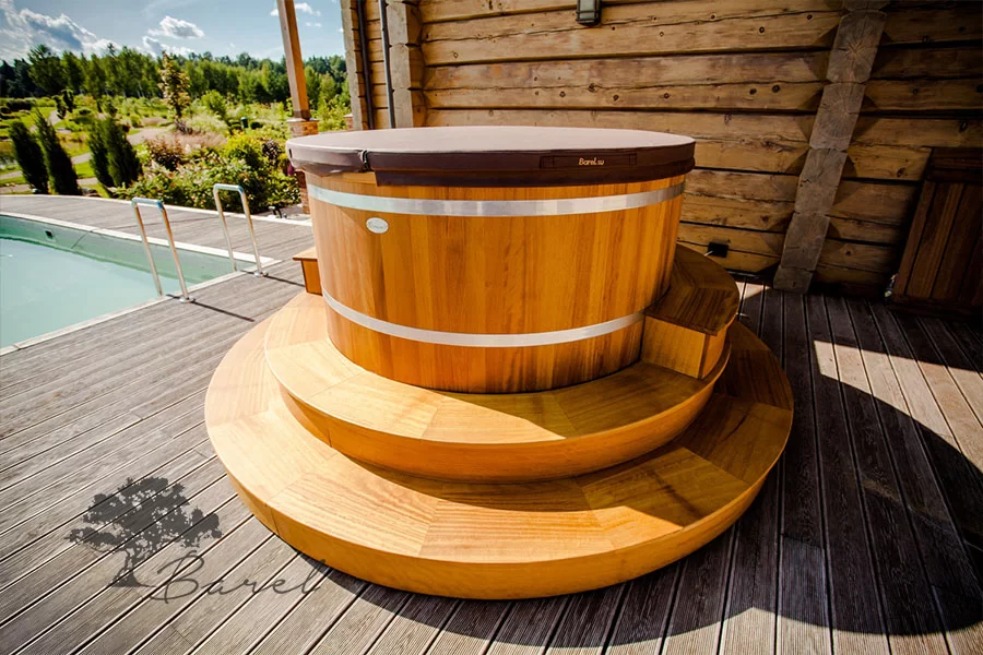 Только из дерева. Толщина древесины 42-45 мм склеена в елочный паз (обязательно хранить с водой)
