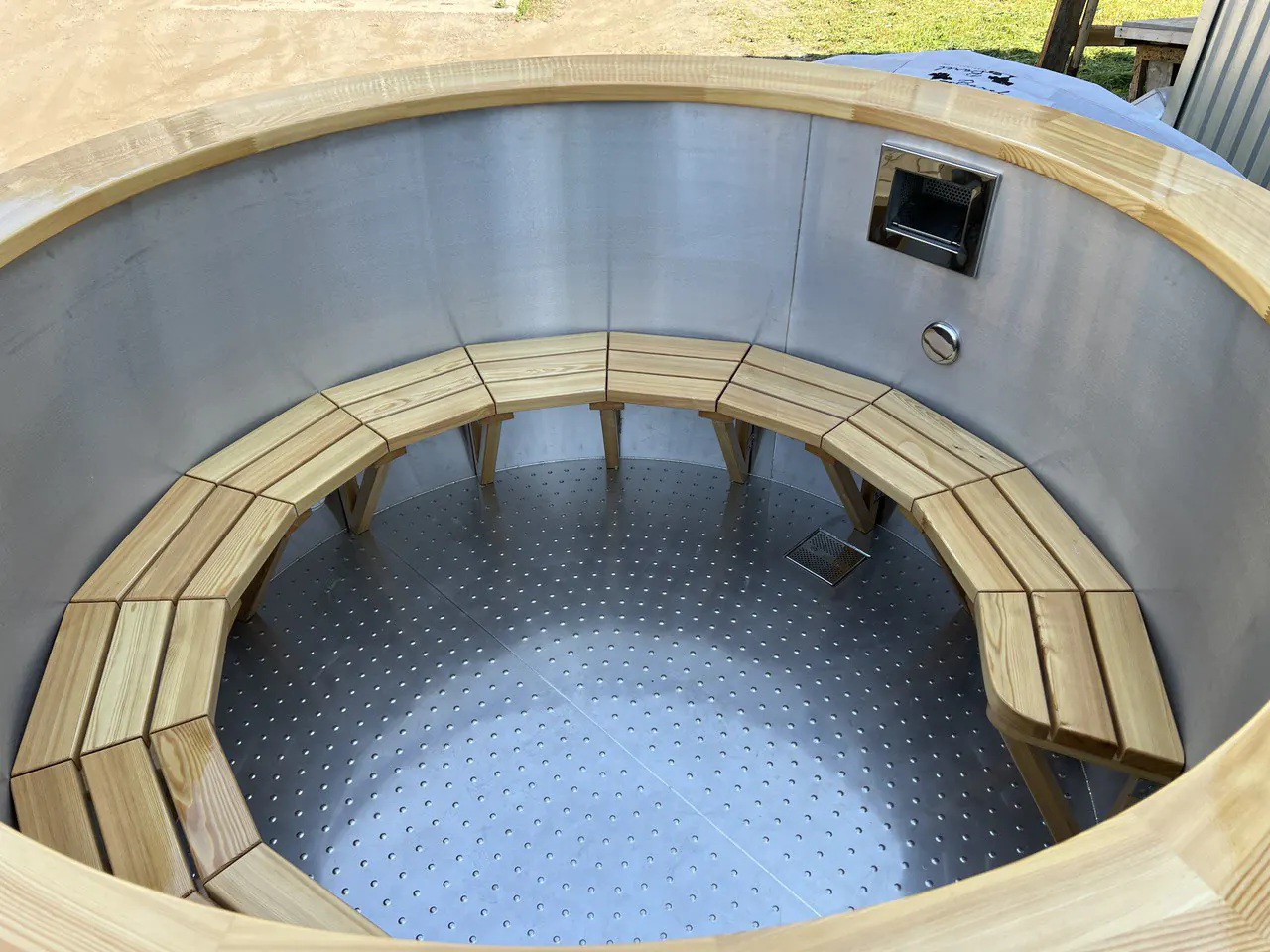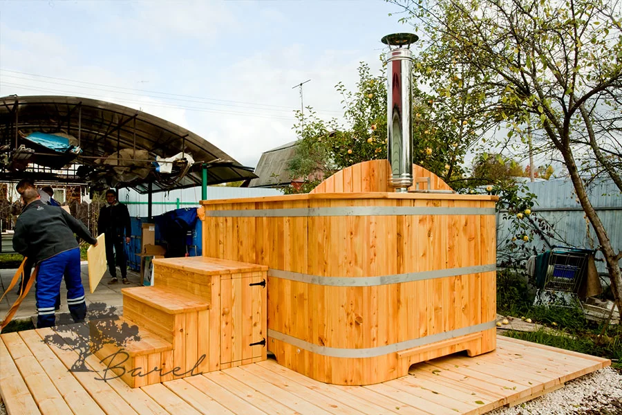 Хоть дровяная печь и забирает небольшой сектор вместилища для купания, с эстетической точки зрения такое расположение печи выигрывает у купели с внешним расположением печи, а также имеет удобный подход для ее эксплуатации и имеет более компактное расположение на участке.