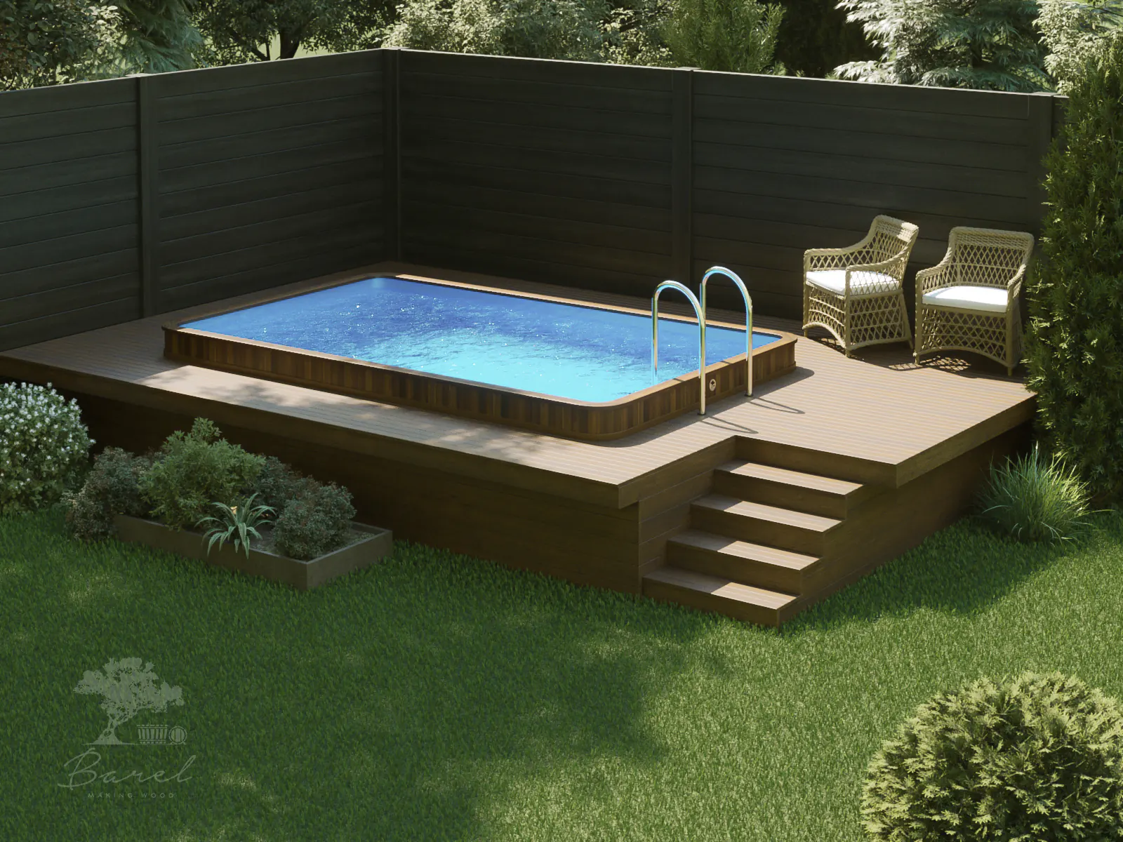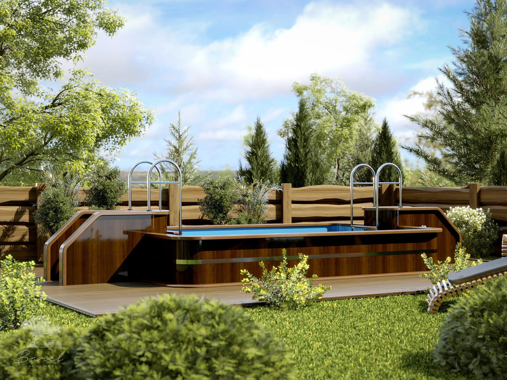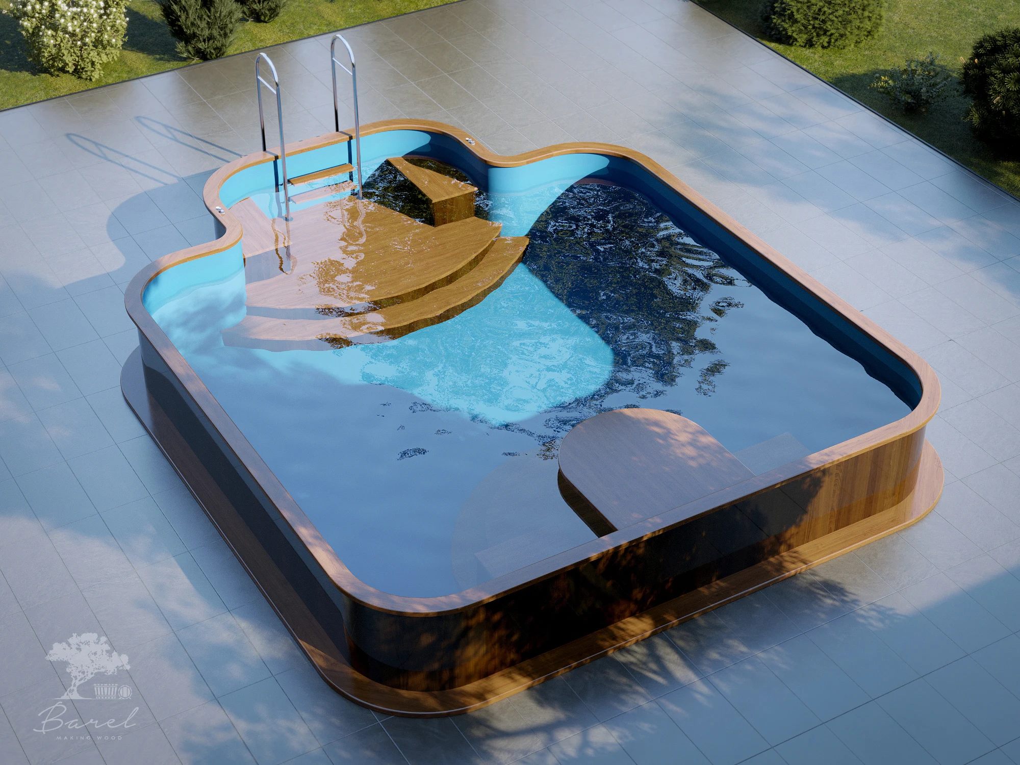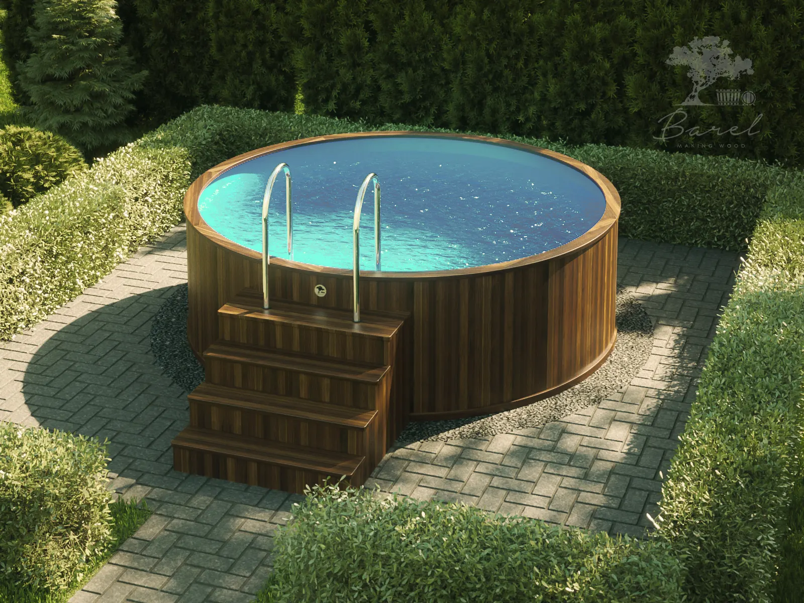Древесина бассейнов проходит многоступенчатую обработку, благодаря чему вы испытаете непередаваемые тактильные ощущения от соприкосновения с идеально гладкой деревянной поверхностью. Технология сборки бассейнов, как и в случае с купелями, по-прежнему, авторская, разработанная лучшими специалистами компании «Барель». Благодаря этому, бассейны из дерева Barelwood прослужат вам многие годы и будут доставлять удовольствие и радость загородного летнего отдыха вам и вашим близким. Деревянные бассейны оборудованы удобными подиумами и периллами для комфортного входа и выхода из воды. Глубина и ширина бассейнов варьируется, в зависимости от потребности клиента. Также, по желанию клиента, бассейны из дерева Barelwood комплектуются широким ассортиментом современного оборудования.