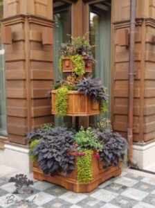 Wood may not be the best choice for making outdoor vases, but it is very affordable, malleable, and easy to work with. That’s probably why it’s so popular. Wooden outdoor flowerpots can be made from scraps of boards, moisture-resistant plywood, timber, tree trunks, stumps, old barrels and tubs.