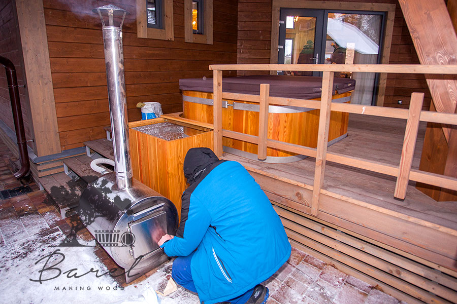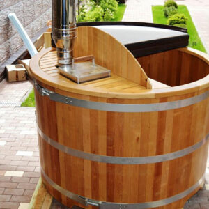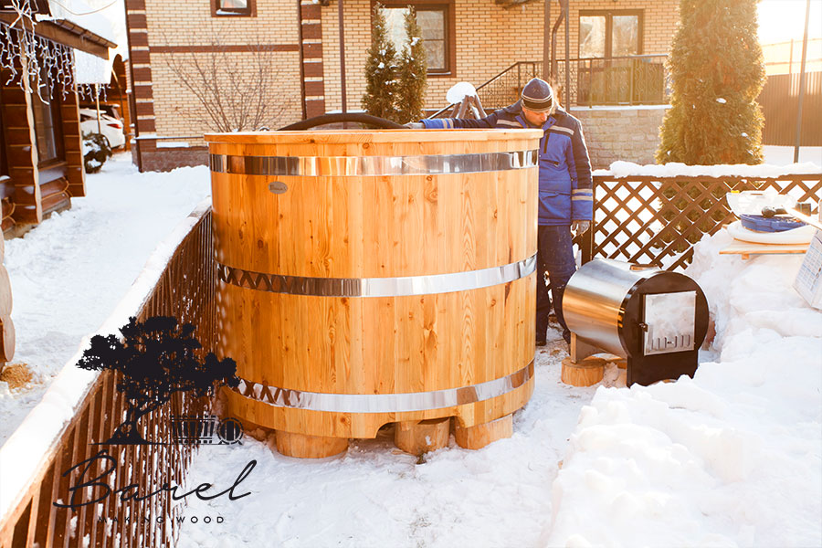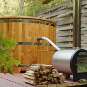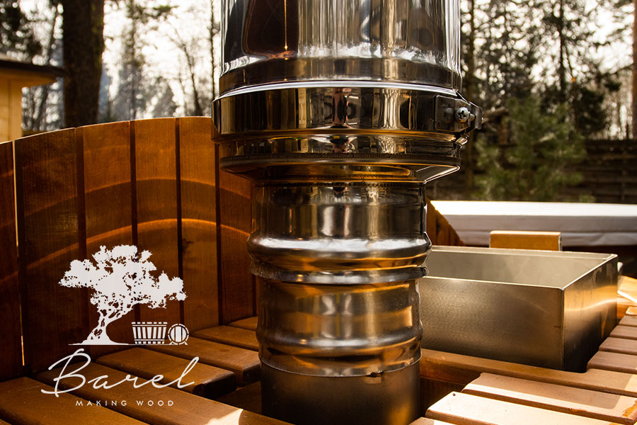 Дровяная печь для купели представляет собой металлическую печь из нержавеющей стали, которая устанавливается снаружи купели.