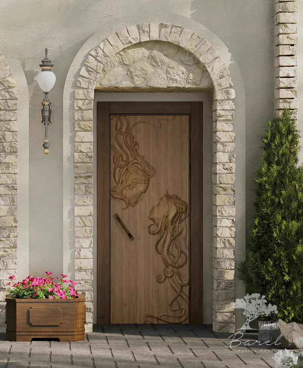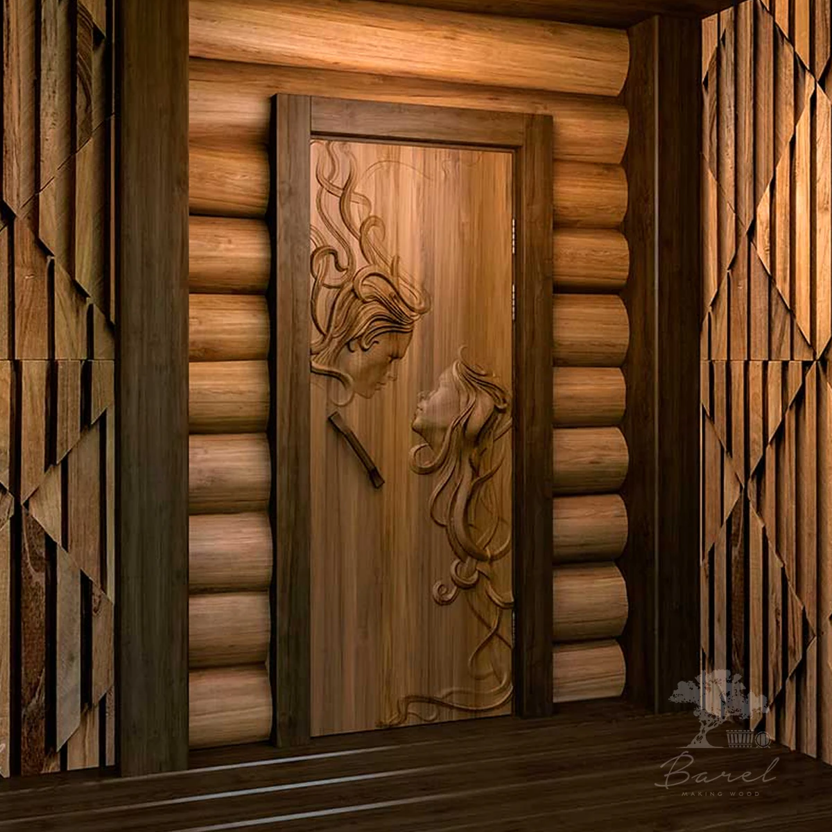 Дверь Barelwood из массива дерева с резной 3d композицией «Идиллия». Древесина высшего качества. Данная резная композиция добавит романтический колорит в концепцию любого интерьера. Идеально подойдёт для бани, сауны или дома.